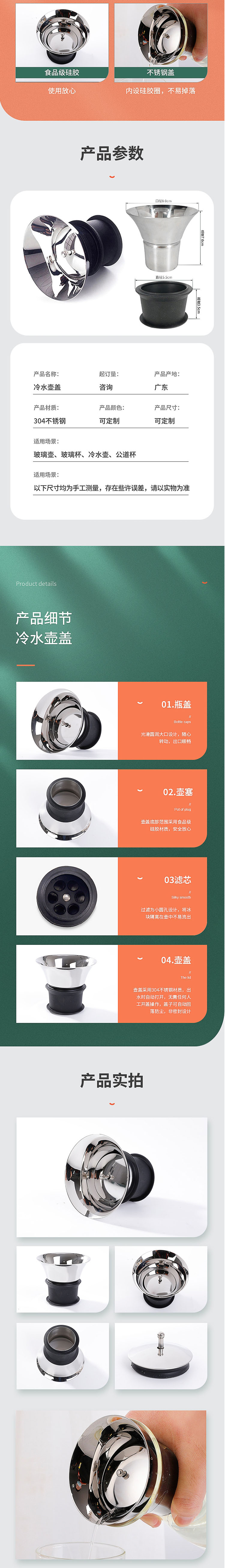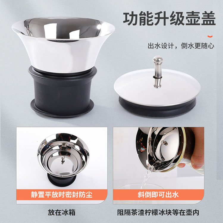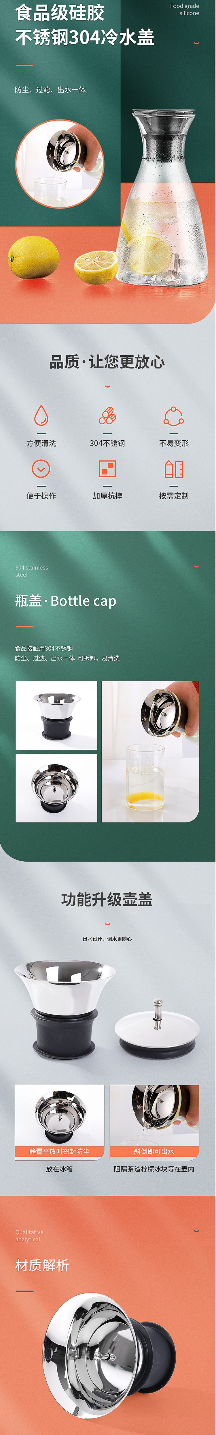 食品接觸用304不銹鋼。防塵、過濾、出水一體可拆卸,易清洗。出水設(shè)計(jì),倒水更隨心。靜置平放時(shí)密封防塵,斜倒即可出水。放在冰箱,阻隔茶渣檸檬冰塊等在壺內(nèi)。硅膠,不銹鋼蓋,內(nèi)設(shè)硅膠圈,不易掉落。